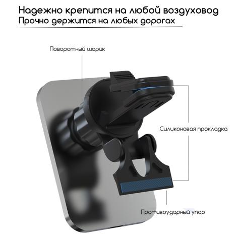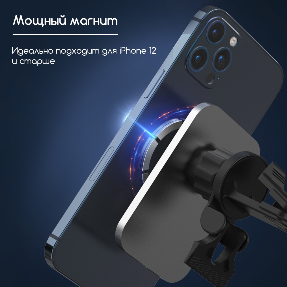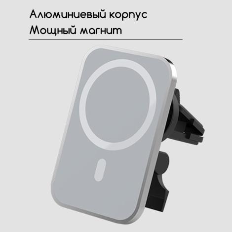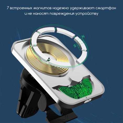 Беспроводное магнитное автомобильное зарядное устройство на айфон для быстрой зарядки вашего смартфона с мощностью 15 вт. Устройство 2 в 1 сочетает в себе беспроводное зарядное устройство и держатель для мобильного телефона с простым креплением на решетку воздуховода. Смартфон держит крепко благодаря встроенным магнитам. Снимается одной рукой. Защита от перегрева, короткого замыкания, превышения допустимого напряжения и силы тока подключенных устройств.