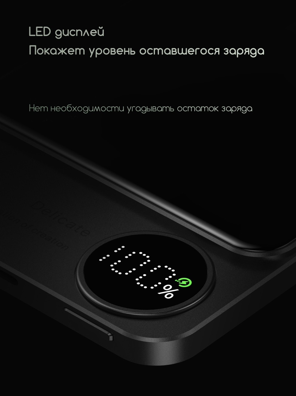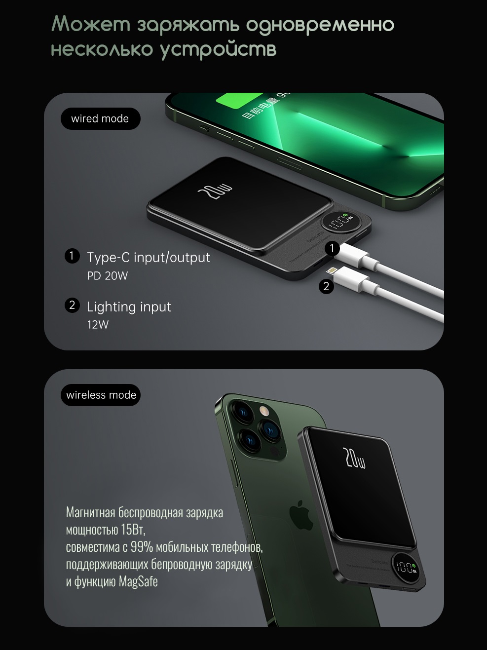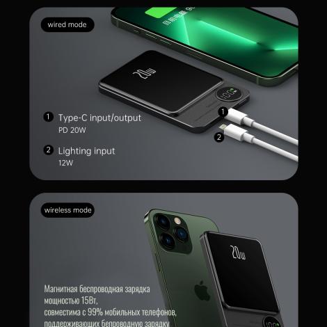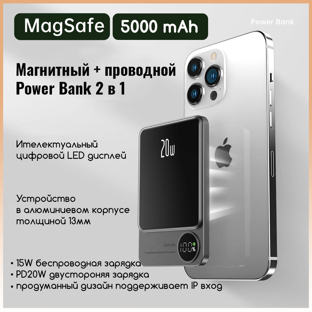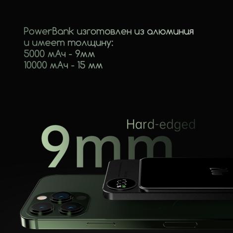 Внешний беспроводной магнитный аккумулятор 5000mAh (Космический Серый) для телефона (толщина всего 13 мм) с функцией MagSafe, подключается к устройству одним прикосновением. Корпус выполнен из алюминиевого сплава и приятен на ощупь. Он небольшой, и с его помощью легко заряжать устройства прямо на ходу. Благодаря LED-дисплею всегда виден остаток заряда PowerBank. Магниты фиксируют аккумулятор в нужном положении для безопасной и надёжной беспроводной зарядки. При этом он никак не воздействует на банковские карты или магнитные ключи.ВАЖНО! Для включения PowerBank и начала зарядки смартфона необходимо нажать кнопку питания, которая расположена на нижней грани устройстваДЛЯ ПОНИМАНИЯ! При беспроводном соединении устройства с телефоном (с помощью магнита) коэффициент передачи энергии (заряда) составляет 0,7. То есть потеря емкости составляет 30%. Из этого следует, что полностью заряженное устройство заряжает iPhone 14Pro с 0 до 75%. При проводном подключении аккумулятора, устройство заряжает iPhone 14Pro с 0 до 100%. Внешний аккумулятор автоматически снижает скорость зарядки или останавливает зарядку до тех пор, пока температура не упадет, если она высокая. Совместим ТОЛЬКО с чехлами MagSafe. Одновременно возможно использовать проводную и беспроводную зарядку, тем самым имеется возможность заряжать несколько устройств