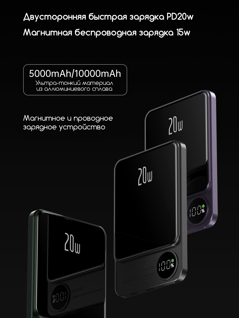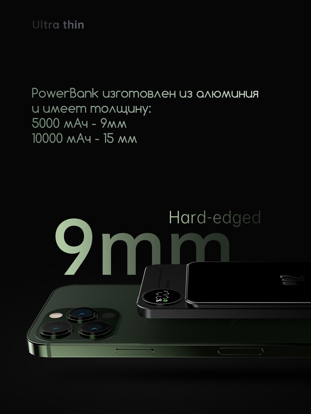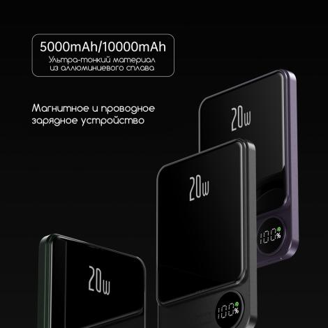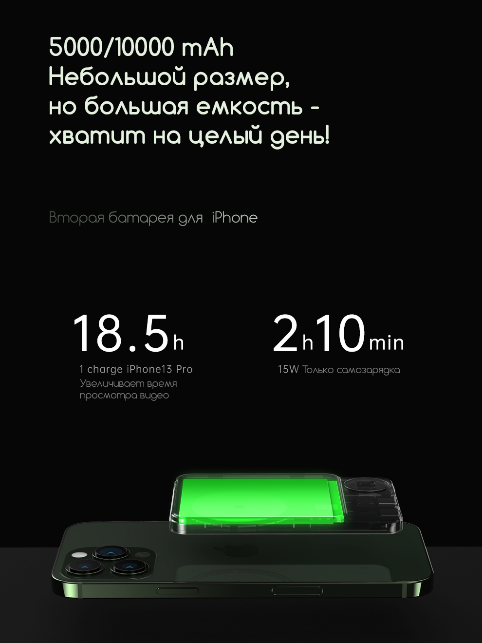 Внешний беспроводной магнитный аккумулятор 5000mAh (Космический Серый) для телефона (толщина всего 13 мм) с функцией MagSafe, подключается к устройству одним прикосновением. Корпус выполнен из алюминиевого сплава и приятен на ощупь. Он небольшой, и с его помощью легко заряжать устройства прямо на ходу. Благодаря LED-дисплею всегда виден остаток заряда PowerBank. Магниты фиксируют аккумулятор в нужном положении для безопасной и надёжной беспроводной зарядки. При этом он никак не воздействует на банковские карты или магнитные ключи.ВАЖНО! Для включения PowerBank и начала зарядки смартфона необходимо нажать кнопку питания, которая расположена на нижней грани устройстваДЛЯ ПОНИМАНИЯ! При беспроводном соединении устройства с телефоном (с помощью магнита) коэффициент передачи энергии (заряда) составляет 0,7. То есть потеря емкости составляет 30%. Из этого следует, что полностью заряженное устройство заряжает iPhone 14Pro с 0 до 75%. При проводном подключении аккумулятора, устройство заряжает iPhone 14Pro с 0 до 100%. Внешний аккумулятор автоматически снижает скорость зарядки или останавливает зарядку до тех пор, пока температура не упадет, если она высокая. Совместим ТОЛЬКО с чехлами MagSafe. Одновременно возможно использовать проводную и беспроводную зарядку, тем самым имеется возможность заряжать несколько устройств