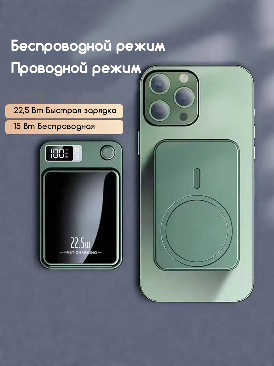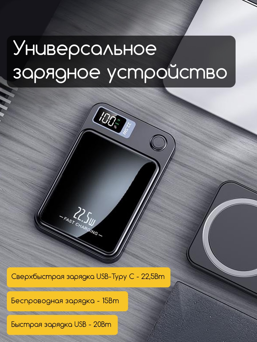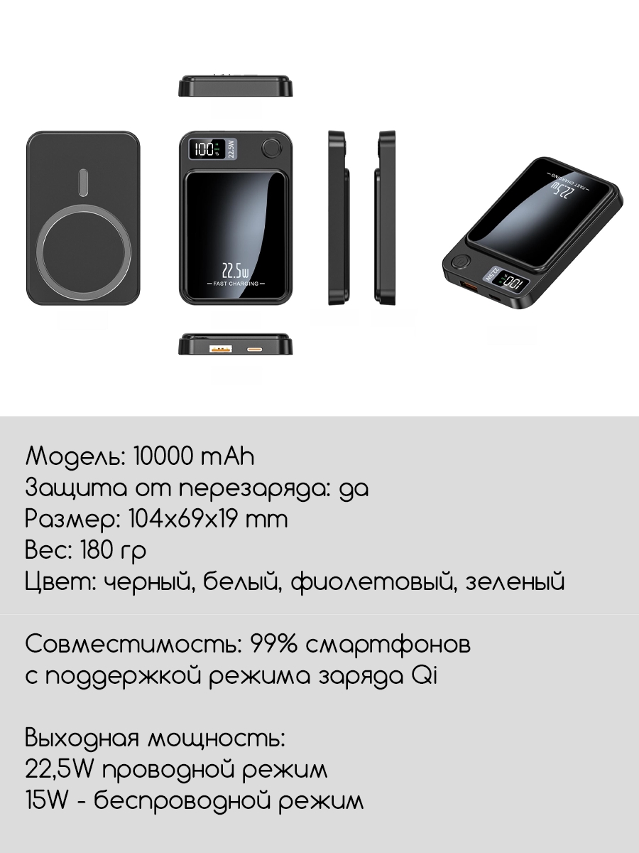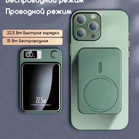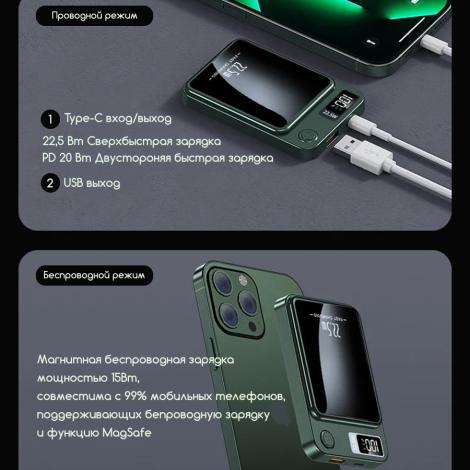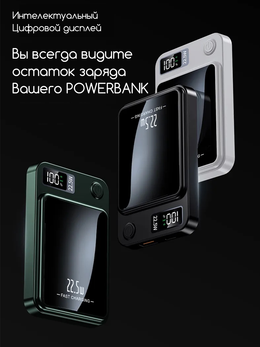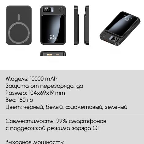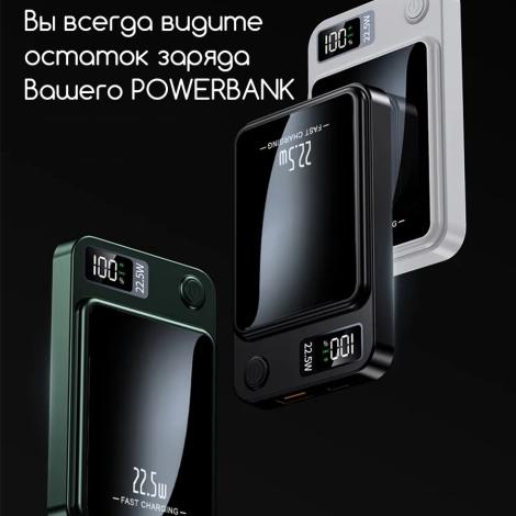 Внешний беспроводной магнитный аккумулятор 10000mAh (Белый) для телефона с поддержкой MagSafe / Magnetic Wireless Charger Power Bank 22,5W, Пластиковый корпус (толщина всего 15мм) подключается к устройству одним прикосновением. Корпус выполнен из пластика. Он небольшой, и с его помощью легко заряжать устройства прямо на ходу. Благодаря LED-дисплею всегда виден остаток заряда PowerBank. Магниты фиксируют аккумулятор в нужном положении для безопасной и надёжной беспроводной зарядки. При этом он никак не воздействует на банковские карты или магнитные ключи.