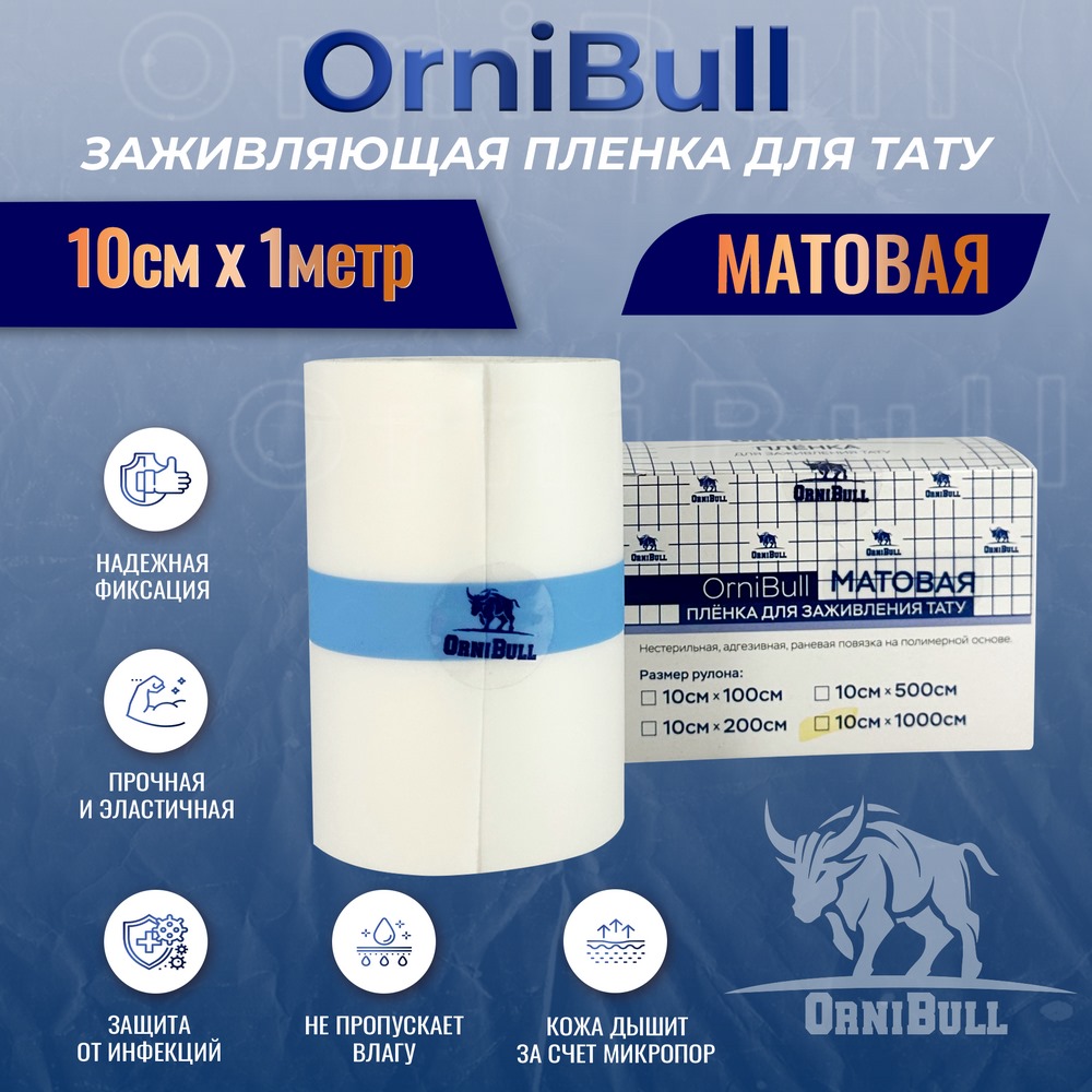 Матовая пленка для заживления тату от OrniBull – инновационное решение для комфортного и эффективного заживления вашей татуировки. Эта специальная заживляющая пленка создана для того, чтобы обеспечить оптимальные условия восстановления кожи после нанесения татуировки. Размер пленки позволяет легко адаптировать её под нужный участок тела. Основное преимущество этой пленки – её матовая поверхность, которая не блестит и позволяет вашей новой татуировке естественно выглядеть даже во время процесса заживления. Пленка для тату обеспечивает надежную защиту от внешних загрязнений и инфекций, предотвращая попадание бактерий и мелких частиц на свежую рану. Благодаря её воздухопроницаемой структуре, кожа может "дышать", что способствует быстрому и безопасному заживлению. Использование такой пленки позволяет избежать трения о одежду, уменьшает риск повреждения рисунка и сохраняет яркость цветов. OrniBull гарантирует, что пленка легко наносится и плотно прилегает к коже, обеспечивая максимальный комфорт. Идеальна как для профессионального использования в тату-салоне, так и для личного ухода в домашних условиях. Клиенты отмечают удобство и практичность этой пленки, особенно в первые дни после нанесения татуировки. Если вам необходимо защитить свою кожу и ускорить процесс заживления, пленка OrniBull станет незаменимым помощником.